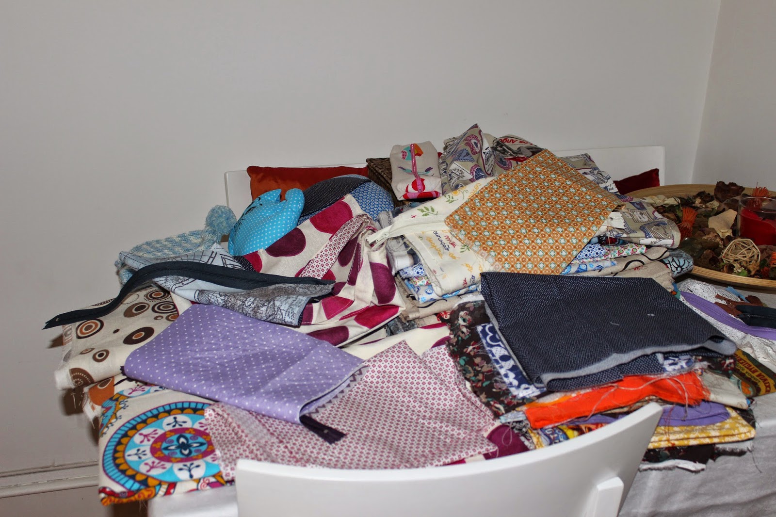 Depois do Natal mostro todas as novidades, agora é cedo pois alguém pode vir espreitar e acabar com a surpresa. Agora, apenas mostro a desarrumação da minha sala pois os tecidos estão espalhados por todo o lado.