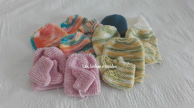 O meu contributo para esta causa tão importante. Fiz 10 gorros e botas, nos vários tamanhos que a Filipa mencionou. Cada novelo de fio deu para 3 gorros e 3 pares de botinhas. Os outros foram feitos com fio que tinha em casa.