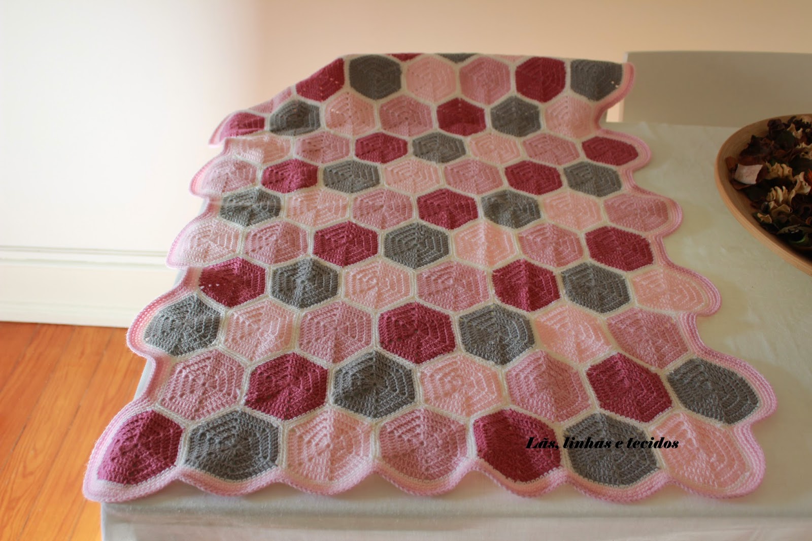 A escolha do modelo foi o mais difícil de decidir, mas depois de muito pesquisar e experimentar, decidi fazer o mesmo modelo de uma que estou a fazer para mim (há tanto tempo!!!!!), em que até as cores são muito idênticas. Daqui a uns tempos vamos estar as duas embrulhadinhas em mantas iguais.
